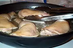 Poaching is a cooking technique that involves heating food submerged in a liquid, such as water, milk, stock or wine. Poaching is differentiated from the other "moist heat" cooking methods, such as simmering and boiling, in that it uses a relatively lower temperature (about 70–80 °C or 158–176 °F).[1] This temperature range makes it particularly suitable for delicate food, such as eggs, poultry, fish and fruit, which might easily fall apart or dry out using other cooking methods. Poaching is often considered a healthy cooking method because it does not use fat for cooking or flavoring the food.[2]