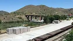 Goods depot at Pocinho station, with the Pocinho Bridge in the background