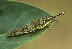 Poekilocerus pictus, the painted grasshopper, aak grasshopper or ak grasshopper, is a fairly large and brightly coloured species of grasshopper found in India, Pakistan and Afghanistan, especially in drier regions.[1][2][3] Both adults and nymphs are toxic; the nymphs are notorious for being able to squirt a jet of noxious liquid at up to around 30 cm (1 ft) away when grasped.[4][5]