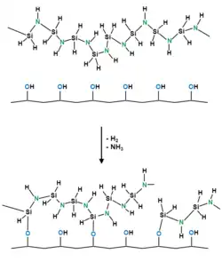 Taking advantage of their reaction with moisture and polar surfaces, polysilazanes are used as coating materials.[7] Many metals, glass, ceramics or plastics with OH groups on the surface are easily wetted by polysilazanes. Reaction of Si–N with OH leads to the formation of Si–O–metal bonds generating good adhesion of the coating to the substrate. The “free” surface of the coating can react with humidity thereby creating a siloxane-like structure with excellent “easy to clean” properties. TutoProm, an organopolysilazane-based product, is used by Deutsche Bahn on their carriages as an anti-graffiti coating. Beyond that, organopolysilazanes can be applied as high temperature coatings or anti-corrosion varnishes.