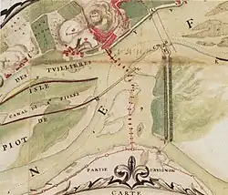 Map from 1685 showing the piers of the bridge. The pier on the bank near the Tour Philippe-le-Bel has been omitted. By this date 10 of the 22 arches had collapsed.