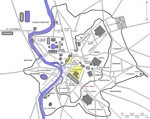The Porta Capena was a gate in the Servian Wall in Rome, Italy. The gate was located in the area of Piazza di Porta Capena, where the Caelian, Palatine and Aventine hills meet. Probably its exact position was between the entrance of Via di Valle delle Camene and the beginning of Via delle Terme di Caracalla (known as the "Archaeological Walk"), facing the curved side of the Circus Maximus.[1]
