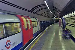 A London Underground train pulling into a tube station