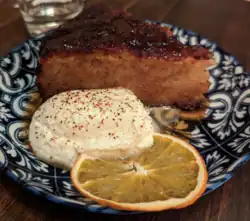 Portokalópita (in Greek, Πορτοκαλόπιτα; from πορτοκάλι portokáli "orange" and πιτα pita "cake") is a typical Greek cake whose main ingredient is sweet orange. Portokalópita is very popular in Greece and is usually consumed as a dessert with coffee.[1] Within Greek pastries, it belongs to the family of cakes called siropiasta, sweets that are bathed in syrup, such as baklava.[2] Although it has a sponge-like appearance, its dough is actually made from dry shreds of filo dough. (φύλλο phyllo), to which a mixture of Greek yogurt, egg and orange juice is added. It is bathed on top with a syrup (liquid sugar) that has been simmered with oranges and sometimes flavored with vanilla and / or cinnamon. Ideally, it is consumed the next day or the day after, when the syrup is fully absorbed and all the flavors of the cake have been integrated.[2] The mouthfeel should be fluffy and juicy, preventing it from being compact.[3]