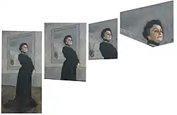 According to his analysis, Serov structured the painting using four distinct viewpoints, visually dividing the figure into separate “frames” by architectural lines—the junctions of floor and wall, the mirror frame, and the ceiling’s reflection. Each section was painted from a different angle: the lower part of the body from above, the knees from eye level, the torso from slightly below, and the head from a low upward angle. The final image, with the actress’s head against the ceiling reflected in the mirror, invites the viewer to look upward. By combining these viewpoints into a continuous whole, Serov created a gradual upward movement of the viewer’s gaze, enhancing the impression of monumentality and inspired ascent. Simultaneously, the composition evokes a downward movement, as if the viewer’s perspective descends toward the base of the figure. This dual motion—rising and falling—generates a dynamic, cinematic rhythm within the still image.[42][43][44] The effect is reinforced by spatial and lighting choices: from bottom to top, the space widens, and each successive "frame" shows increasing illumination of Yermolova’s face against a receding background. This progression creates a sense of intensifying radiance and spiritualisation.[45][46]