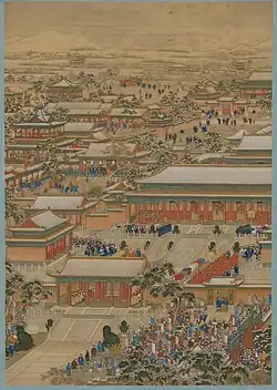 Ten Thousand Nations Coming to Pay Tribute (simplified Chinese: 万国来朝图; traditional Chinese: 萬國來朝圖; pinyin: Wànguó láicháo tú, 1761) is a monumental (299x207cm) Qing dynasty painting depicting foreign delegations visiting the Qianlong Emperor in the Forbidden city in Beijing during the late 1750s.[13]