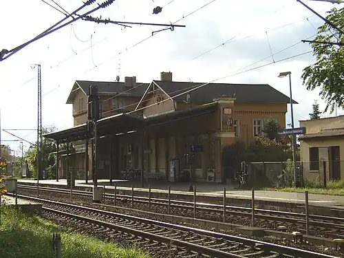 Potsdam Medienstadt Babelsberg station is a station on the Berlin–Blankenheim railway located in the east of the Potsdam district of Drewitz near Babelsberg, the historic center of the German film industry, and the former West Berlin exclave of Steinstücken. The station's DS-100 code is BDW[1] and its station's numerical code is 5013.[2] It is classified by Deutsche Bahn as a category 5 station.[2]