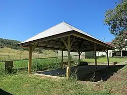 The playshed is a small six-post timber structure with concrete slab floor and a hipped roof clad in corrugated metal sheeting. The posts are braced to the roof framing by brackets and the roof framing is exposed. Notches in the posts along the western side and corrugations in the edge of the floor slab indicate that an enclosing wall of corrugated metal sheeting has been removed from this side.[1]
