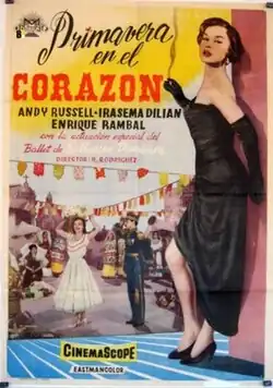 Spring in the Heart (Spanish: Primavera en el corazón) is a 1956 Mexican musical comedy film directed by Roberto Rodríguez and starring Andy Russell, Irasema Dilián and Enrique Rambal.[1] [2] It was shot in Eastmancolor at the Churubusco Studios in Mexico City. The film's sets were designed by the art director Salvador Lozano Mena.