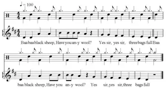 However, the relationship between syllables and melodic notes is just one dimension of musical prosody. According to Pat Pattison, prosody is "The appropriate relationship between elements, whatever they may be."[1] In this sense, every element in a song can and should create prosody, because prosody is "support for what is being said."[2] In this sense, even the number of lines in a verse or a verse's rhyme scheme can be used to create or enhance prosody.[3]