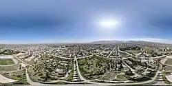 The modern coat of arms and flag of the city of Karakol were approved as a result of the competition for the creation of symbols of the city (coat of arms, flag and anthem), organized in March 2007 by the city council and the mayor's office of the city.[13] The main composition of the coat of arms and the flag consists of elements of the sun and the head of a deer with horns (symbols of the Buğu tribe).