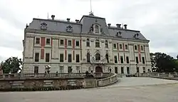 During the Polish January Uprising in 1863 Poles smuggled large amounts of gunpowder through the town to the Russian Partition of Poland.[5] From 1871 Pleß was part of Germany, however, at the beginning of the 20th century, over 80 percent of the district's population spoke Polish; during the 1910 census 86 percent declared as Polish speakers,[6] though in the town itself the percentage of Polish speakers was 33.[7] When World War I erupted, the Hochbergs lent the estate to the German state for military purposes. The German chief of staff held his headquarters at the castle of Pleß, often visited by Emperor Wilhelm II himself.