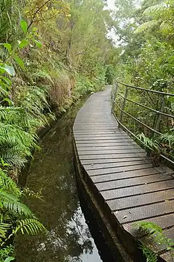 The Pupu Hydro Walkway is a 1.5 to 2 hour loop track starting at the end of the unsealed Pupu Valley Road, past the more well-known Pupu Springs.[3] The walk passes through the mature podocarp and beech forest of Kahurangi National Park, first zig-zagging up to the penstock, and then following the gentle gradient of the historic gold mining water-race along the steep hill side for 1.7 kilometres (1.1 mi) on a narrow boardwalk. The concrete water race and the boardwalk have been restored, including continuous railing on the sections along steep drop-offs.