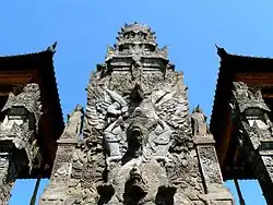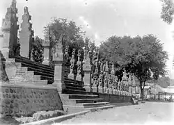 At the entrance of the temple is a parade of 36 stone figures representing characters from the Indian epic Ramayana. The sculptures are set on three levels, 13 figures in the lowest row, ten in the middle row, and 13 in the rear highest row. which is flanked by two entrance staircases. The central figure is Kumbhakarna, while surrounding him are the monkey troops of Sugriwa. The twin staircases lead to the entrance terrace (jaba pura). A candi bentar split gateway marks the threshold into the jaba pisan, the outer sanctum of the temple.[1]