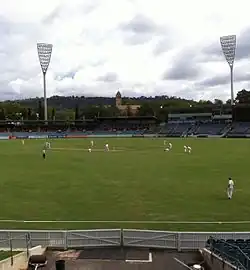 The Queanbeyan District Cricket Club entered the ACT competition with the Federal Territory Cricket Association in the latter's inaugural season in 1922-23.[21] Queanbeyan's home ground at this stage was Queanbeyan Park and it won the Premiership in the 1927-28 and 1928-29 seasons.[22] It was on a canvas-covered concrete pitch on 11–18 December 1926 that Queanbeyan scored 527 (Clarrie and Sid Hincksman scoring 246 and 105 respectively).[23] In the 1935-36 FCTCA final against a Northbourne team that fielded champion Lorne Lees, Tom O'Connor for a Queanbeyan side with only 10 men took 6/27 (off 17.4 overs) and 5/63 before coming to the wicket at 6/127 with 180 needed to win. O'Connor hit 46 (including 13 and 19 off his two overs from Lees, with six fours and a six) of the 53 needed to win the match.[24] Other notable performances by the club included scoring 728 in 10 hours in a semi-final against Ginninderra in 1985-86 (M Frost 164, P Solway 119, J Bull 106, M Thornton 97, M Carruthers 112), its 651 against ANU in 1989-90 (P Solway 339) and the dramatic final win in 1990-91 over Weston Creek (R Regent 63 and P Solway 53 and 43 off 56 balls) with Neil Bulger conceding only 1 run off 11 overs in dismissing Weston Creek for 89 with seven balls left to play.[25] In January 2012, Queanbeyan (with a team including brothers Blake and Jono Dean) won the final of the SCG Country cup against Merewether District Cricket club, Queanbeyan being the first ACT Cricket team to have reached the final (played at the SCG).[26] In the 2011-12 two day Grand Final Blake Dean, batting at 7 with the score 87-5 hit 130 from 191 balls to set up 394 in the first innings.[27] On Feb 2 2013 Jono Dean scored an unbeaten 300 runs in a single day for Queanbeyan against Ginninderra in a Douglas Cup Match; the innings including 17 sixes and 21 fours and was the second highest individual innings in ACT first-grade cricket history.[28] On 2 November 2013 Jono Dean scored 234 and Blake Dean (cricketer) 69 in a total of 6-437 declared against Weston Creek Molonglo[29] The Queanbeyan win by 6 runs against Tuggeranong on 2 Feb 2014 in ACT First grade John Gallop Cup grand final at Manuka oval was regarded as one of the best one day games ever played on the ground.[30] In 2014, after his first year for the ACT Comets, Queanbeyan 1st grade all-rounder Vele Dukoski was named Cricket Australia Futures League 'Player of the Year' and later that week scored a hundred in Queanbeyan's semi-final win.[31]