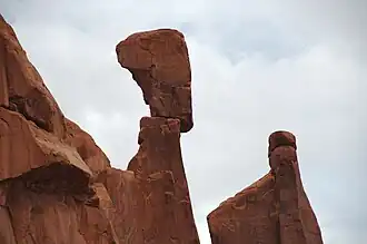 Queen Nefertiti Rock is a 4,741-foot-elevation (1,445-meter) pillar in Grand County, Utah. The feature is located within Arches National Park and like many of the rock formations in the park, Queen Nefertiti Rock is composed of Entrada Sandstone. Topographic relief is significant as the summit rises 400 feet (122 meters) above the Park Avenue Trail in 0.1 mile (0.16 km). Precipitation runoff from Queen Nefertiti Rock drains to the nearby Colorado River via Courthouse Wash. This landform's descriptive toponym has been officially adopted by the United States Board on Geographic Names,[1] and is so named because the feature resembles the head of Queen Nefertiti.[4][6]