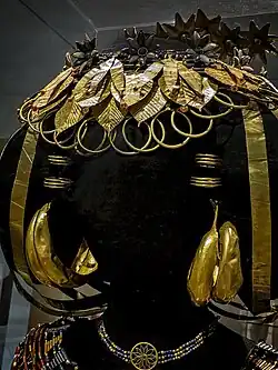 Queen Puabi's headdress is a 2600–2450 BCE Mesopotamian crown consisting of ornate gold leaf wreaths, strands of lapis lazuli and carnelian beads, with a gold comb, and delicate hair ribbons.[1] The entirety of the headdress is estimated to weigh over 6 pounds.[2] The headdress was discovered resting on Queen Puabi's remains in PG 800 during the excavation of the Royal Cemetery at Ur that began in 1922 and concluded in 1934.[3][1] Successive Mesopotamian societies built new cities on top of previous civilizations and commonly created tells (multilayer man-made mounds) to preserve human remains.[4] These younger tells (built on top of Queen Puabi's grave) hid and protected her immense riches by making them inaccessible to looters.[4] Found next to Queen Puabi's remains was a cylinder (identification) seal with the title "nin" inscribed, indicating a great lady or queen.[5] In the grave, excavators also found the remnants of female attendants – adorned in similar jewelry and hair ribbons – whose purpose was to serve the queen in her afterlife.[6] The religious significance of Queen Puabi's headdress demonstrates her royal status as well as her cultic importance.[7] The unearthing of Ur was led by Charles Woolley and was a joint expedition sponsored by the Penn Museum and the British Museum.[4] The headdress currently resides in the Penn Museum in Philadelphia. The excavation is still very popular because of the riches discovered, the uncovering of a mass grave, and the potential connection with Abraham from the book of Genesis. [4]