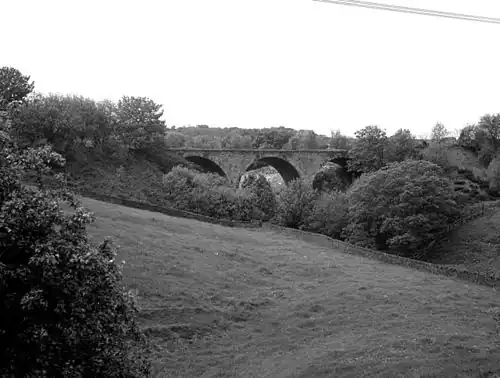 The station at Queensbury has been filled in by inert landfill.[21] The viaduct in the photograph has been demolished and nothing remains except a pile of rubble.[22] The only real trace of the station is a little iron footbridge and the portal of Queensbury Tunnel. Clayton tunnel west portal can be found in a large crater that has not been infilled just beyond the iron footbridge.