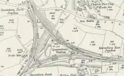 Queensbury railway station was a station on the Queensbury lines serving the village of Queensbury, West Yorkshire, England. The station was unusual due to its triangular shape, and at its opening the only other examples of this arrangement were Ambergate station in Derbyshire and Earlestown in Lancashire; since then Shipley station, also in West Yorkshire, has gained platforms on all three sides.[1] Of the stations on the Queensbury lines, this was the most ambitious.