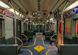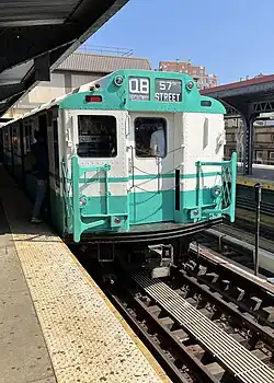 • Car 3189 has been preserved by the New York Transit Museum. The car had an experimental 3-passenger transverse fiberglass interior seating installed in 1969, which has since been removed. It was retired from revenue service in 1984, but was later repainted solid blue and used as a training car for road car inspectors at the TA's Pitkin Yard in Brooklyn. The car was restored to operating status in 2022 – during which the car was repainted into the aqua blue/white scheme – and has been operating on New York Transit Museum-sponsored excursions since September 2022.[17]
