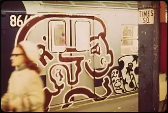 A graffiti-covered R29 train at Times Square-42nd Street in May 1973