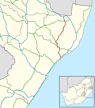 The R66 is a provincial route in KwaZulu-Natal, South Africa that connects Gingindlovu with Pongola via Eshowe, Melmoth and Ulundi.[1] It starts and ends at a junction with the N2.[1]