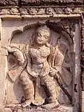 The roof of this temple is square and curved, with curved edges and a domed shikhar (tower) in the middle.[2] The temple is known for its ornamentation, which adorns the surrounding walls of this temple. The ornamentations are mainly placed on terracotta plaques set into the walls.[1] The walls of the temple are decorated with scenes from the Ramayana, Anantasayin Vishnu and widely recurring figures of Radha-Krishna.[5]