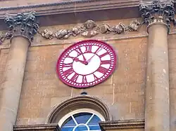 It was reported that by 1855 that 98 percent of towns and cities had transferred to GMT.[5] On the other hand, not all railway companies convinced the local dignitaries to bring their clocks on public buildings in line without stern resistance. Although by 1844 the Bristol and Exeter Railway was running to London Time, the public clocks at both Exeter and Bristol operated to local time but showed London Time by a second minute hand, 14 and 10 minutes ahead, respectively, of its companion. In Exeter this situation arose due to the reluctance of the Dean of Exeter Cathedral to concede to the demands of the railway company, the cathedral clock being the principal timekeeper for the city. Similarly, the clock at The Bristol Exchange installed in 1822 subsequently had a second minute hand added.[12] Bristol did not solely recognise railway time until September 1852.[13] It was not for a further eight years and the arrival of the electric telegraph that railway time was the sole time recognised in these towns and others in the West Country, including Bath, Devonport and Plymouth. Another town that stood its ground was Oxford where the great clock on Tom Tower at Christ Church, Oxford had two minute hands.[14]