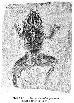 Rana architemporaria is an extinct species of true frog from the Pliocene that was found in Kabutoiwa, near the Arafune volcano, Central Japan.[1] It was found at an altitude of 1200 meters.[2] The species was described from a single specimen, but another specimen of Rana architemporaria may also have been found later in 1980, though it was not deemed a definitive ID. This specimen was also dated to around the Pliocene.[3]