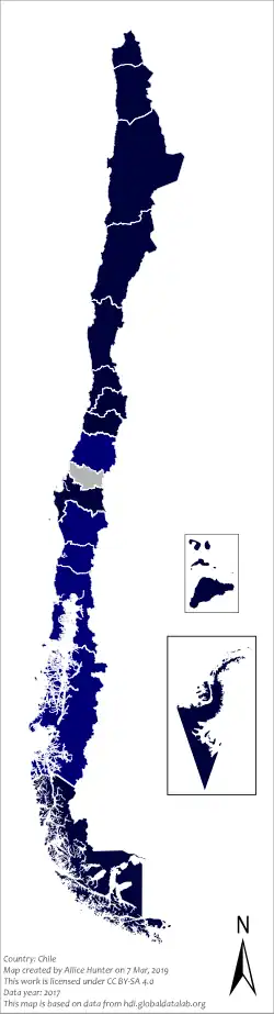 Chilean regions by their human development index. This is an HDI constructed for Chile and it is not comparable to HDIs for other countries.