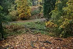 For many decades of Seattle city history, the Ravenna Park ravine had been ignored by loggers and farmers and still possessed full old-growth timber rising nearly 400 feet (120 m).[3][4][5] Most of the land was owned by mining and real estate magnate William Wirt Beck who, in addition to preserving the ravine's trees for park land, would give Ravenna its name (after Ravenna, Italy) and would plat one of the first subdivisions in the neighborhood in 1890 around the home he built that still stands East of the park at NE 60th Street and 26th Avenue NE.[6] The trees remained through the Alaska–Yukon–Pacific Exposition of 1909, at which they were featured exhibitions. Public controversy about them declined after their gradual disappearance in suspicious circumstances by 1926.[7] Today, none of that size remain anywhere in the world.[3][5][8]