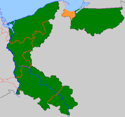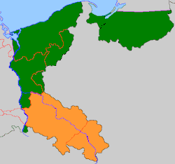 Location of southern East Prussia (orange) and of the other "Recovered Territories" (green)
