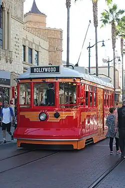 The Red Car Trolley was a 3 ft 3+3⁄8 in (1,000 mm) meter gauge tramway and transportation attraction at Disney California Adventure at the Disneyland Resort in Anaheim, California.[1] Construction began on January 4, 2010, and the attraction opened on June 15, 2012, as part of the re-dedication of the park.[2][3] The attraction featured cars inspired by the Pacific Electric Railway's "Red Cars" that once traversed much of Southern California. It provided transportation between the park's main entry at Buena Vista Street and Sunset Boulevard in Hollywood Land.[4]