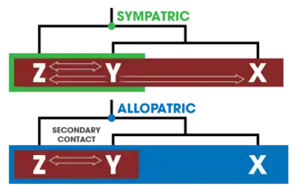 - ^ a b Mark Kirkpatrick and Virginie Ravigné (2002), "Speciation by Natural and Sexual Selection: Models and Experiments", The American Naturalist, 159: S22–35, doi:10.1086/338370, PMID 18707367, S2CID 16516804