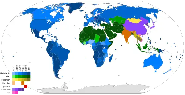 There are an estimated 10,000 distinct religions worldwide,[11] though nearly all of them have regionally based, relatively small followings. Four religions—Christianity, Islam, Hinduism, and Buddhism—account for over 77% of the world's population, and 92% of the world either follows one of those four religions or identifies as nonreligious,[12] meaning that the vast majority of remaining religions account for only 8% of the population combined. The religiously unaffiliated demographic includes those who do not identify with any particular religion, atheists, and agnostics, although many in the demographic still have various religious beliefs.[13] Many world religions are also organized religions, most definitively including the Abrahamic religions Christianity, Islam, and Judaism, while others are arguably less so, in particular folk religions, indigenous religions, and some Eastern religions. A portion of the world's population are members of new religious movements.[14] Scholars have indicated that global religiosity may be increasing due to religious countries having generally higher birth rates.[15]