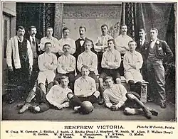 The first reference to the club is of its playing in the Renfrewshire Junior Cup in the 1890–91 season.[3] The Vic entered the Scottish Junior Cup for the first time in 1893–94,[4] Renfrew surprised many by reaching the final, played at Abercorn's Underwood Park, but the Vic did not show up well on the day, and lost 3–1 to Ashfield. The decisions of referee McPhee so angered the Vic fans that at one point they rushed the pitch and knocked him down, and in the ensuing melée many of the players joined in;[5] the Vic protested against the result, but the protest was dismissed, and the Scottish JFA censured the Renfrew side for failing to protect the referee.[6] The club also reached the final of the Renfrewshire Junior Cup the same season, but went down to the Greenock Volunteers.[7]