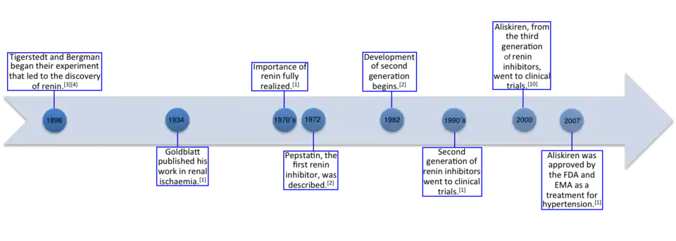 In 1896, the Finnish physiologist Robert Tigerstedt and the Swedish physician Per Bergman did an experiment on kidneys and the circulatory system in rabbits. They observed that blood pressure rose in the rabbits when extracts of the kidneys were injected into their jugular veins.[9][10] They also discovered this substance responsible for higher blood pressure was produced in the renal cortex, and they named it renin.[10] Although this experiment laid the foundation for future investigations into the RAAS pathway, it had little impact on the scientific community at that time.[9][11] In 1934, when Goldblatt published his work in renal ischaemia, renin came into focus again. The importance of renin in the pathogenesis of cardiovascular disease was, however, not fully understood until in the 1970s, and 20 years later the first renin inhibitors went to clinical trials.[7]
