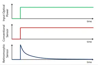 Retinomorphic sensors are a type of event-driven optical sensor which produce a signal in response to changes in light intensity, rather than to light intensity itself.[1] This is in contrast to conventional optical sensors such as charge coupled device (CCD) or complementary metal oxide semiconductor (CMOS) based sensors, which output a signal that increases with increasing light intensity. Because they respond to movement only, retinomorphic sensors are hoped to enable faster tracking of moving objects than conventional image sensors, and have potential applications in autonomous vehicles, robotics, and neuromorphic engineering.[2][3][4][5]