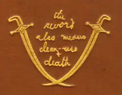 Tooling on the cover of the first public printing, showing twin scimitars and the legend: "the sword also means clean-ness + death"