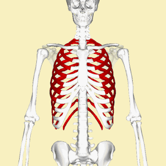 The first seven sets of ribs, known as "true ribs", are attached to the sternum by the costal cartilages. The first rib is unique and easier to distinguish than other ribs. It is a short, flat, C-shaped bone, and attaches to the manubrium.[6] The vertebral attachment can be found just below the neck at the first thoracic vertebra, and the majority of this bone can be found above the level of the clavicle. Ribs 2 through 7 then become longer and less curved as they progress downwards.[7] The following five sets are known as "false ribs", three of these sharing a common cartilaginous connection to the sternum, while the last two (eleventh and twelfth ribs) are termed floating ribs.[2] They are attached to the vertebrae only, and not to the sternum or cartilage coming off of the sternum.