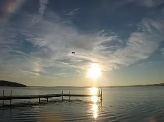 Rice Lake is a lake located in Northumberland and Peterborough counties in south-eastern Ontario. The lake is located south of the city of Peterborough, and the Kawartha Lakes and north of Cobourg. It is part of the Trent-Severn Waterway, which flows into the lake by the Otonabee and out via the Trent. The lake is 28 kilometres (17 miles) long and 5 km wide. Its maximum depth is 10m, with a surface water level at 187 m above sea level, raised to its present height by the Hastings Dam, built in the 19th century as part of the Trent-Severn canal system.[1] The Indigenous Mississaugas called it Pemadashdakota or "lake of the burning plains".[2]