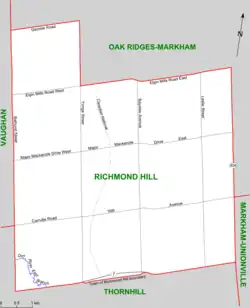 The electoral district consists of the part of Richmond Hill lying south of a line starting at the intersection of Bathurst Street and Elgin Mills Road West, east along Elgin Mills to Bayview, south along Bayview to the unnamed creek north of Taylor Mills Drive North, along the creek to Shirley Drive, Shirley Drive south to Major Mackenzie Drive, and east on Major Mackenzie to the eastern city limits. It also contains the part of the City of Markham east of Bayview Avenue, north of Highway 407, and west of Highway 404.[3]