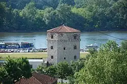 Memorial plaque in front of Nebojša Tower in Belgrade, where Rigas Feraios was strangled