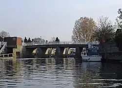 Close to its start, Ember Mill stood on an island in the Ember reached from a footbridge at the end of Orchard Lane by Imber Court, East Molesey. The mill was demolished around 1837 and the sluices and waterfalls on either side are all that remain to indicate the site.[2] The mill was originally a corn mill but was later used for manufacturing brass and iron wire.[3] This part of the Ember is bypassed by the new channel of the flood prevention scheme, but a small flow runs into the old course to keep it looking largely as it used to.[4]