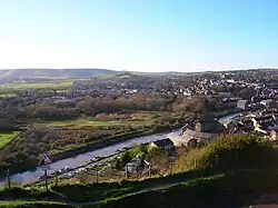 Part of the problem of flooding was caused by longshore drift creating a huge shingle bar across the river mouth, which had gradually moved eastwards to Seaford, some 2 miles (3.2 km) from its position in Roman times. The bar prevented the river from draining effectively, and made it difficult for ships to enter the estuary.[26] Prior Crowham of Lewes Priory sailed to Flanders and returned with two drainage experts. In 1537 a water-rate was levied on all lands on the Levels to fund the cutting of a channel through the shingle bar at the mouth of the Ouse, below Castle Hill at Meeching, to allow the river to drain the Levels. This canalisation created access to a sheltered harbour, Newhaven, which succeeded Seaford as the port at the mouth of the Ouse.[27]