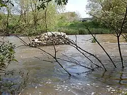 | A ruined pier of the medieval New Bridge, in mid-stream 140 yards downstream of the 19th-century New Bridge[6] | ||||