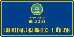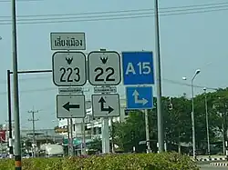 Road signs in Thailand are standardized road signs similar to those used in other nations but much of it resembles road signage systems used in South American countries with certain differences, such as using a blue circle instead of a red-bordered white circle to indicate mandatory actions.[1] Until the early 1980s, Thailand closely followed American, European, Australian, and Japanese practices in road sign design, with diamond-shaped warning signs and circular restrictive signs to regulate traffic. The Department of Railway maintains a standard on the typeface used in the sign, with custom made type for Thai text, unofficially named "Thang Luang" (อักษรทางหลวง) and a small derivation of FHWA Series fonts ("Highway Gothic") typeface, which is used on American road signage, for Latin text.[2] In most Bangkok Metropolitan Area's routes, TS Lopburi is still used.
