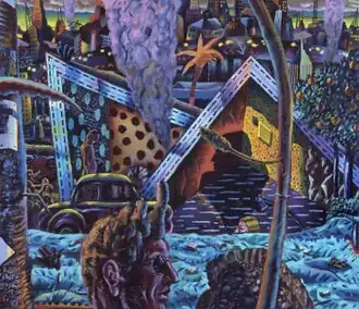 In works such as Miami (1984) or Inheritance (1985), Cocke depicted eerie, surreal scenarios of urban neglect and paradises lost.[5][23][4] Their Bosch-like compositions were packed with repressed and corrupted figures, architectonic forms, apocalyptic fires, acrid smoke, and shattered remnants of science and culture that suggested wide-ranging allusions and metaphors.[5][11][22] Discussing later works, such as The Quest for Knowledge (1989), Robert Cauthorn identified a more introspective, spiritual dimension amid the desolation: "Cocke's work is a study in planes of existence: virtue vs. corruption, the natural world vs. technology … The battleground for these factions is our spirit."[22]