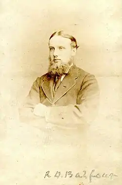 Robert Drummond Balfour was born on 1 March 1844 in Putney, Surrey and was educated at Bradfield College, from 1857 to 1859 at Westminster School,[3] and then at Magdalene College, Cambridge.[4] He was a right-handed, middle or lower-order batsman and wicket-keeper. By the time he went up to Cambridge Balfour had already played a good standard of club cricket for I Zingari and for a XXII of Cirencester against the United All-England Eleven.[5] He made his first-class debut for Cambridge University against MCC in 1863, and remained a first choice in the eleven for five years.[3][6][7]