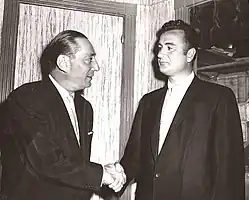 A film reviewer for the communist Daily Worker, Howard Rushmore was fired for a too favorable review of Gone With The Wind. He moved to the New York Journal-American and became a professional anticommunist. He later became director of research for Senator Joseph McCarthy's Subcommittee on Investigations in 1953. After a dispute with the subcommittee's chief counsel, Roy Cohn, Rushmore resigned. At the Journal-American, Rushmore criticized Cohn in print and was fired from the paper.[46] Then his mentor, Walter Winchell, got him a new editorial job.[47] Under Winchell's sponsorship, Howard Rushmore became the chief editor[48] of Confidential.